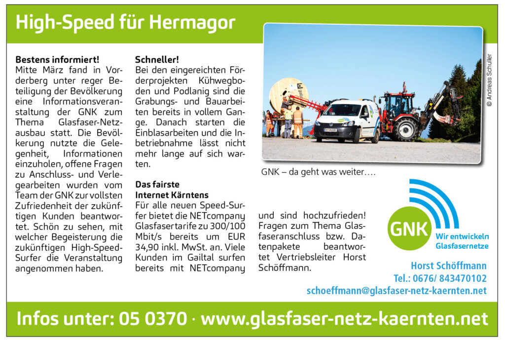 Bericht Gailtal Journal – High-Speed für Hermagor geschrieben am 01.04.2024 von GNK GmbH Hier geht´s zum Bericht…